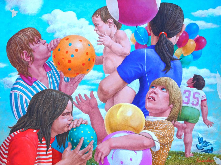 Vincent lost his father before he was born and when his oldest brother Edward was 4. For all of their lives Ed was like a father figure to Vincentl. The artist also imagines himself as an infant in his mothers arms as his big brother blows up the orange balloon symbolizing fatherhood. The dark haired woman looking away is his mother holding him as a baby, and who is at the same time watching him run away with his over sized bundle of balloons. Thirty five is the age at which Vincent's dreams seemed shattered, and a year before everyone's balloon would burst with Edwards death. The birds are a symbol of ever present hope, as they land with practicality on solid ground.
